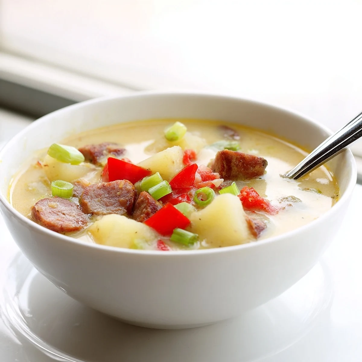 The technique involves building flavor through sausage browning, vegetable aromatics, and a simple flour-thickened base before simmering potatoes until perfectly tender. Partial mashing creates that ideal creamy consistency while keeping satisfying potato chunks throughout.