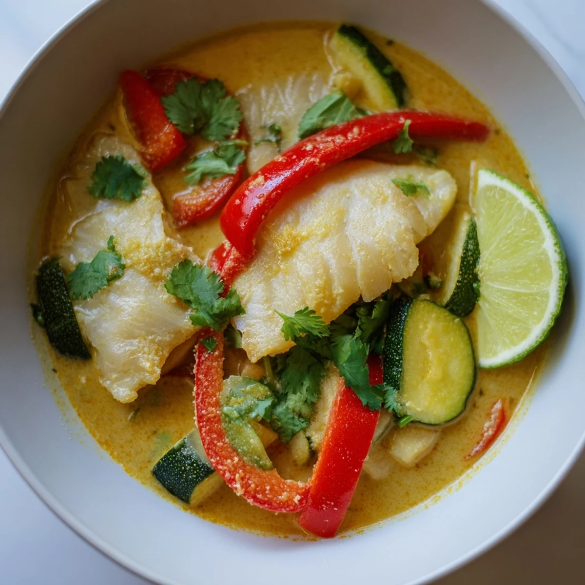 This aromatic stew combines tender chunks of white fish with a luscious coconut milk base infused with ginger, turmeric, and coriander. Fresh vegetables like bell pepper, carrot, and zucchini add color and texture while absorbing the fragrant broth. Ready in under an hour, the dish balances richness from coconut milk with brightness from lime and fresh cilantro.