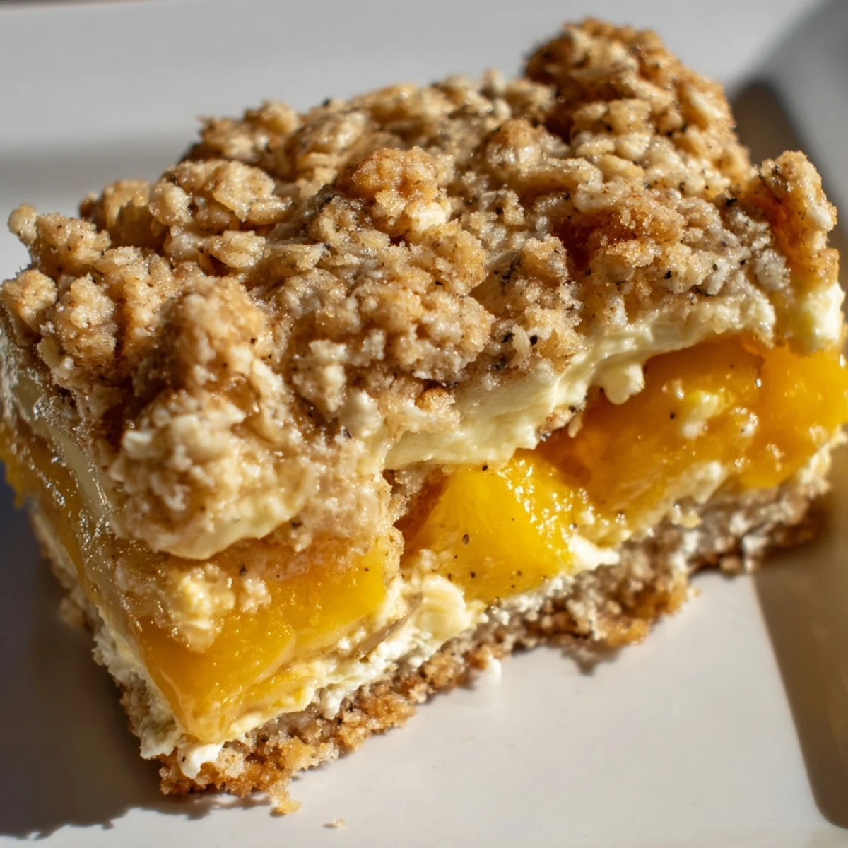 My neighbor brought over a basket of peaches from her tree last summer, more than we could possibly eat fresh. I stood in the kitchen staring at them, already thinking about crumble, when I wondered what would happen if I tucked that same buttery oat topping around something creamy in the middle. The bars that came out of the oven were exactly what summer afternoon cravings are made of.