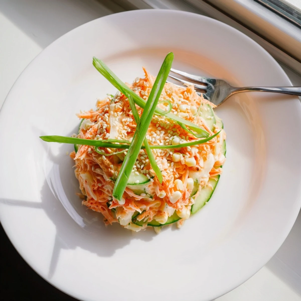 This vibrant Japanese-inspired dish combines delicate shredded imitation crab with refreshing julienned cucumber and carrot, all coated in a rich creamy dressing made from Japanese mayonnaise and Sriracha. The contrasting textures—crisp vegetables against tender crab strands—create an appealing mouthfeel, while toasted sesame seeds add nutty depth. Perfect as a light appetizer or satisfying lunch, this versatile dish comes together quickly and stores well for meal prep. Adjust the heat level to your preference by varying the chili sauce amount.
